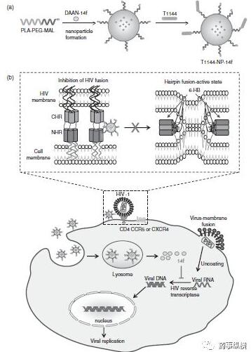 ͼ£¨a£©NPsÓÉÓÃÓÚÒ©Îï°ü·âµÄ¿ÉÉúÎï½µ½âµÄPLA½¹µãºÍÓÃÓÚ¿ÅÁ£Îȶ¨ÐÔµÄPEGÁ´×é³É£»£¨b£©HIV-1ºÍÄÉÃ׿ÅÁ££¨T1144-NP-14f£©ÔËÊäµÄʾÒâͼºÍT1144-NP-14fÒÖÖÆHIV-1ѬȾµÄÍÆ¶¨×÷ÓûúÖÆ