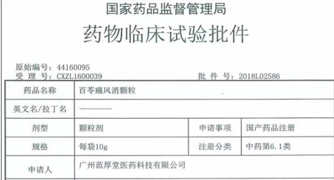 2018Äê7Ô£¬Ð§ÀͿͻ§¹ãÖÝ·¶ºñÌÃÒ½Ò©¿Æ¼¼ÓÐÏÞ¹«Ë¾É걨µÄÖÐÒ©6.1ÀàÐÂÒ©¡°°ÙÜßÍ´·çÏû¿ÅÁ£¡±»ñµÃCFDAÐû²¼µÄÒ©ÎïÁÙ´²ÊÔÑéÅú¼þ£»