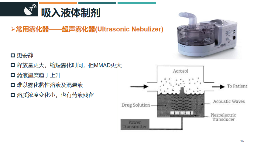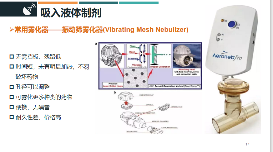 ¡°Ä¿Ç°Êг¡Ö÷Á÷µÄÎüÈëÒºÌåÖÆ¼ÁÖ÷ÒªÓÐÈýÖÖ£¬»®·ÖÊÇÅçÉäÎí»¯Æ÷¡¢³¬ÉùÎí»¯Æ÷¡¢Õñ¶¯É¸Îí»¯Æ÷ÈýÖÖ¡£¡±ÀîöÎÓíÈÏΪ£¬ÈýÖÖÎí»¯Æ÷¸÷ÓÐËù³¤£¬ÅçÉäÎí»¯Æ÷»ùÀ´Ô´ÀíÊDz®Å¬ÀûÔÀí¡¢½á¹¹¼òµ¥¡¢ÄÍÓ㬵«²ÐÁôÎïÌå»ý½Ï´ó¡¢»á·ºÆðÅãͬҩҺζÈϽµ¡¢Å¨¶ÈÉý¸ßµÈÏÖÏó£»Ïà±ÈÓÚÅçÉäÎí»¯Æ÷£¬³¬ÉùÎí»¯Æ÷µÄÊÍ·ÅÁ¿¸ü´ó£¬ÄÜÓÐЧËõ¶ÌÎí»¯Ê±¼ä£¬µ«ÆäҩҺζÈÉÏÉý½Ï¿ì£¬ÄÑÒÔÎí»¯ð¤ÐÔÈÜÒº¼°»ìÐüÒº±¸ÊÜÚ¸²¡£»Õñ¶¯É¸Îí»¯Æ÷Ïà±ÈÉÏÊöÁ½ÕßÔò¾ßÓвÐÁôÎïÉÙ¡¢Ê±¼ä¶Î¡¢ÎÞÃ÷ÏÔ¼ÓÈÈ¡¢¿ÉÎí»¯¶àÖÖÀàµÄÒ©ÎïµÄÓÅÊÆ£¬ÆäȱµãÔòÊÇÄ;ÃÐԽϲ¼Û¸ñ¸ß°º¡£