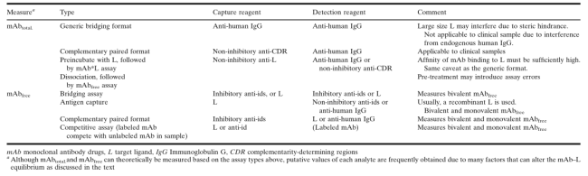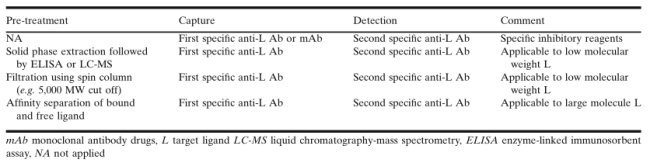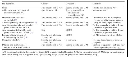 ±ðµÄ£¬ÔÚ¼²²¡Ä£ÐÍ»òÌØ¶¨»¼ÕßȺÌåÖУ¬°Ð±êÅäÌåµÄ×´¿ö¿ÉÄÜÓ뽡¿µ±ÈÕÕȺÌåÓÐןÜÊDzî±ðµÄÇé¿ö£¬ËùÒÔÁ˽âÔÚ²î±ðÎïÖֺͼ²²¡×´Ì¬ÖзºÆðµÄmAb/L±ÈÖµµÄ¿É±äÐÔÒ²ºÜÖØÒª¡£×ÝȻӵÓи߶ȱíÕ÷µÄÊÔ¼Á£¬Ò²Ó¦¸ÃÀí½âmAb-LÔÚÌåÄÚÊÇÒÔ¶¯Ì¬Æ½ºâµÄ·½·¨±£´æµÄ£¬Òò´ËÌåÍ⣨ex vivo£©µÄ²âÊÔÌõ¼þ£¨ÀýÈçÑù±¾Ï¡ÊͺͷõÓýʱ¼ä£©»áÓ°ÏìmAbºÍLµÄ¶¨Á¿ÒÔ¼°ËüÃÇÁ½ÕßÖ®¼äµÄƽºâ£¬¿ÉÒÔͨ¹ýÑо¿mAb-Lƽºâ£¬ÆÊÎö²Ù×÷°ì·¨£¬ÆÀ¹ÀʵÑé½á¹û£¬À´ÅжÏËüÃÇÊÇ·ñÕæÊµ·´Ó¦ÁËÑо¿Ñù±¾ÖеĽáºÏ¹ØÏµ£¨binding relationships£©¡£±¾Îĵıí¸ñÖÐËùÁгöµÄÑùÆ·´¦ÀíÕ½ÂԺͶ¨Á¿ÒªÁ죬¾³£ÊÊÓÃÓÚÒªÁ쿪·¢£¬ÆäÄ¿µÄÊǶ¨Á¿ÆÊÎöÓÎÀ루free£©µÄ¡¢×ÜÌ壨total£©µÄºÍ½áºÏÁË£¨bound£©µÄmAbºÍLµÄÖÖÖÖÐÎʽ¡£
