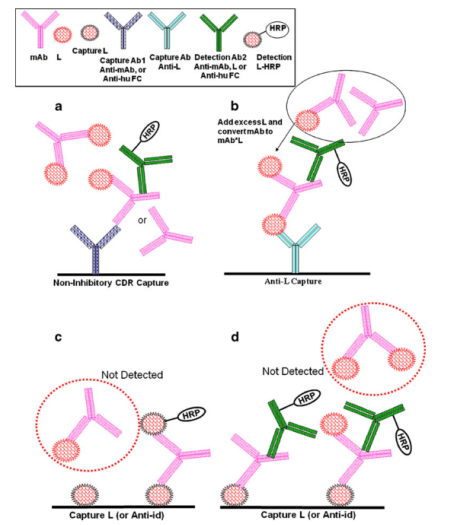 ¶ÔÌØÒìÓÚmAbfreeµÄ²âÊÔ»¨Ñù£¬Ò»¶ÔÊÔ¼ÁÖÐÖÁÉÙÓÐÒ»¸öÊÔ¼Á±ØÐëÓë´ý²âÎïµÄͬһλµã½áºÏ¡£ÕâЩÊÔ¼Á¿ÉÄÜÊÇÓëL¾ºÕù½áºÏµÄanti-idiotypic¿¹Ì壨¼´inhibitory anti-ids£©»òÕßÊÇL×Ô¼º£¨Í¼2c£¬ d£©¡£ÕâÖÖÆÊÎö·½·¨µÄÒ»¸ö±äÖÖÔ´×ÔÊÔ¼ÁµÄ×éºÏÓ¦Óã¨ÀýÈ磬¡°ÇŽÓbridging¡±»¨ÑùÖУ¬Ê¹ÓÃÏàͬµÄÊÔ¼Á²¶»ñºÍ¼ì²âmAb£¬L×÷Ϊ²¶»ñÊÔ¼Á£¬Óëanti-idiotypic¿¹Ìå½øÐнáºÏ¼ì²â£¬·´Ö®ÒàÈ»£©¡£ÇŽӻ¨ÑùµÄÒ»¸öÓŵãÊÇΪÁËÄܹ»±»¼ì²âµ½£¬mAb±ØÐëÒªÓÐÁ½¸öfunctionally free½áºÏλµã¡£Ê¹ÓÃLµÄ²¶»ñ·½·¨ÒªÇómAbÖ»ÓÐÒ»¸ö¹©¼ì²âµÄÓÎÀë½áºÏλµã£¬²¢ÇÒ¶ÔÓÎÀëºÍ²¿·ÖÓÎÀëµÄÒ©Îï¶¼ÓÐÌØÒìÐÔ¡£µ«ÆÊÎö½á¹û²¢Ã»ÓнÒʾÕâÁ½ÖÖÐÎʽµÄÏà±ÈÕÕÀý¡£